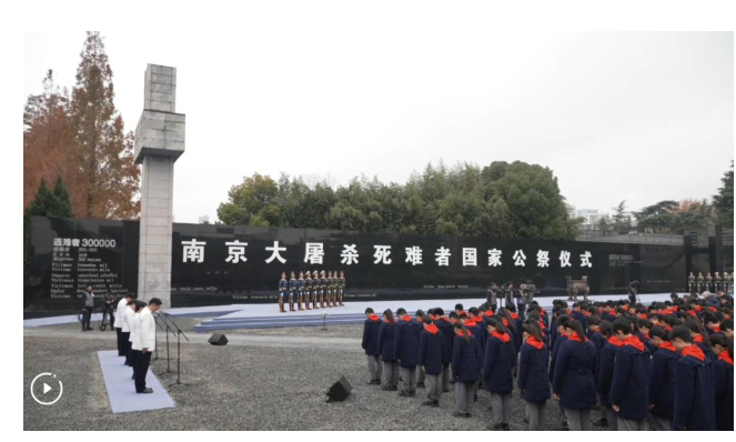 *At the square of the Memorial Hall of the Victims in Nanjing Massacre by Japanese Invaders, thousands dressed in dark attire gathered with white flowers pinned to their chests. China's national flag was flown at half-mast in front of the crowd that included survivors of the massacre, local students and international friends.