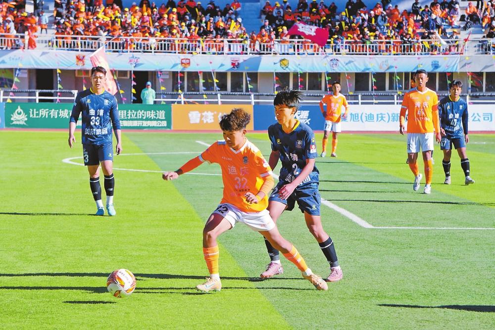 尽管香格里拉天气寒冷,还是有1.8万名球迷来到迪庆藏族自治州民族体育中心体育场观战,比赛氛围热烈。开赛后,双方球员迅速进入状态,长传、抢断、射门等攻防转换轮番上演。主场作战的迪庆队球员凭借对场地的熟悉,多次利用快速传切创造进攻机会。曲靖队则依托丰富的经验稳扎稳打掌控中场节奏,并率先破门。下半场,迪庆队加强攻势,多次组织起有威胁的反击,并顽强地扳回一球,将1:1的比分维持到了常规时间结束。点球大战中,双方球员顶住压力展开比拼,最终曲靖队以5:4的比分险胜。