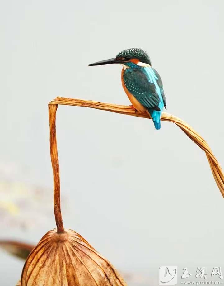冬阳把玉溪瀑布生态公园的池面涂上一层暖金,枯荷残梗斜映在水里,像一幅淡墨图画。忽然,一抹亮绿划破清冷——一只翠鸟翩然而至。