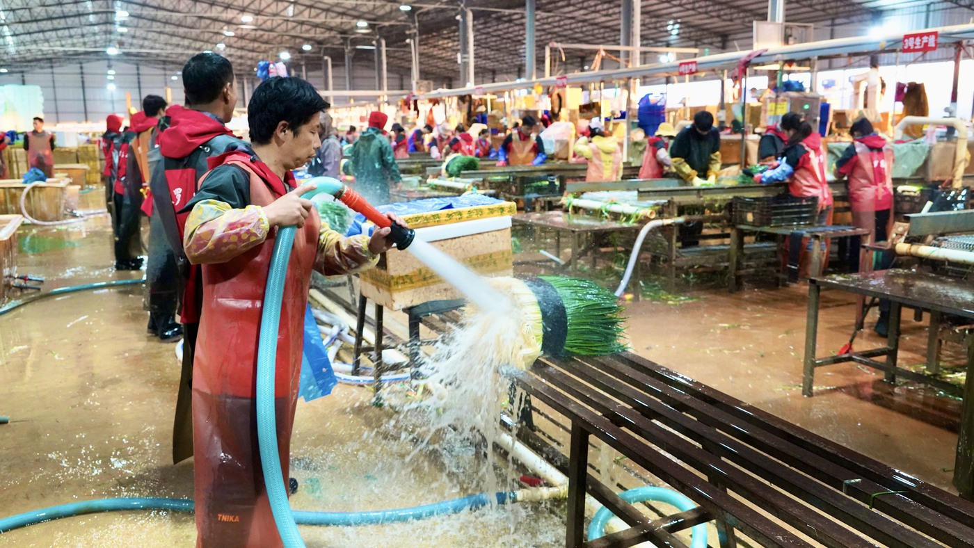 12月14日下午,走进曲靖市师宗县芳尔农产品开发有限公司的洗葱车间,这里迎来一天中最热闹的时候。传送带隆隆作响,工人身着防水围裙,手持高压水枪,冲刷着堆积如山的香葱。水花飞溅间,泥土褪去,青白分明的葱身逐渐显露本真色泽。