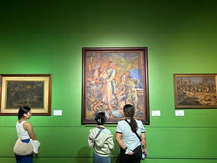 参观者在菲律宾国家美术馆二战主题展厅参观,该展厅陈列着二十余幅描绘日军暴行的画作。(新华社记者 张怡晟 摄)