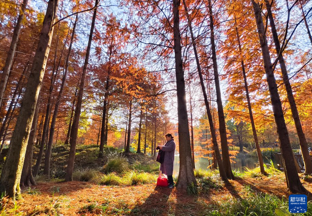 12月14日,游客在江苏常州红梅公园观赏枫叶美景。冬日时节,不少地方的红叶依旧绚丽,吸引人们游玩赏景。新华社发(王启明摄)