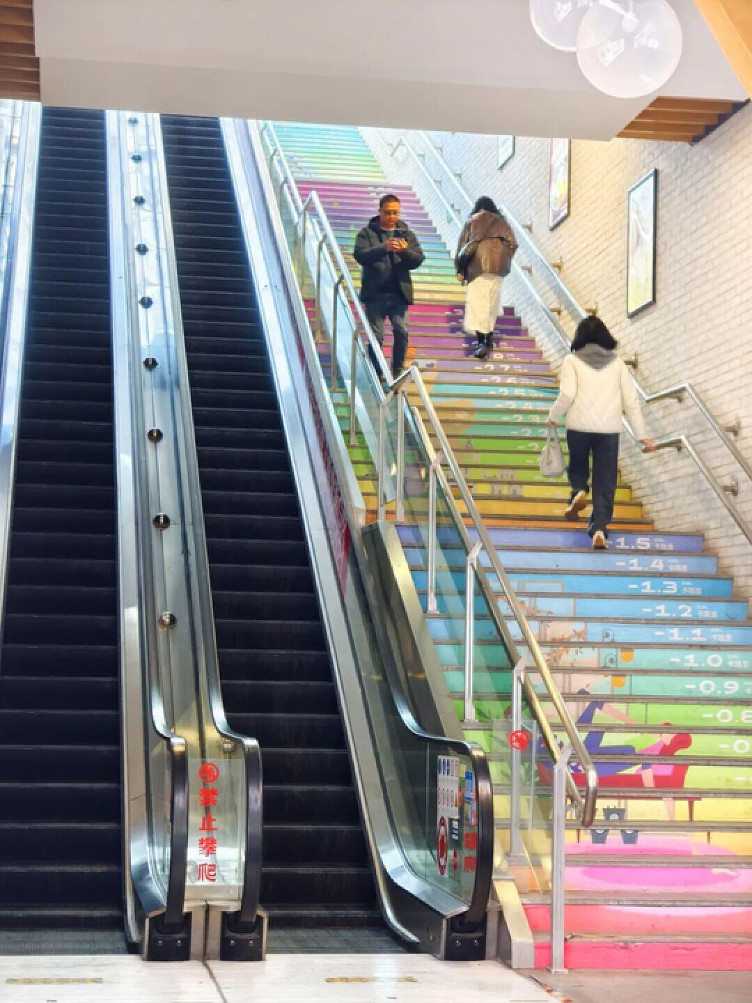 在商场内,记者看到一名拄着拐杖的老人发现电梯并未运行,于是寻找其他出口。还有不少上班族在爬楼梯,一男子手提行李箱,吃力地从楼梯步行而下。