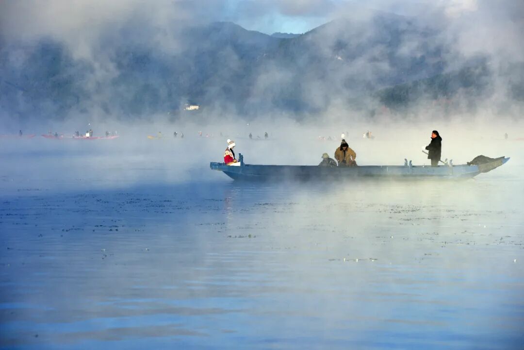 据了解,泸沽湖晨雾的形成得益于独特的自然条件,海拔2690米的高原环境造就了超过15℃的昼夜温差,湖水蒸发的水汽遇冷凝结,加之格姆女神山等群山环绕的地形让雾气不易消散,最终形成了这一持续至次年2月的冬日限定盛景。