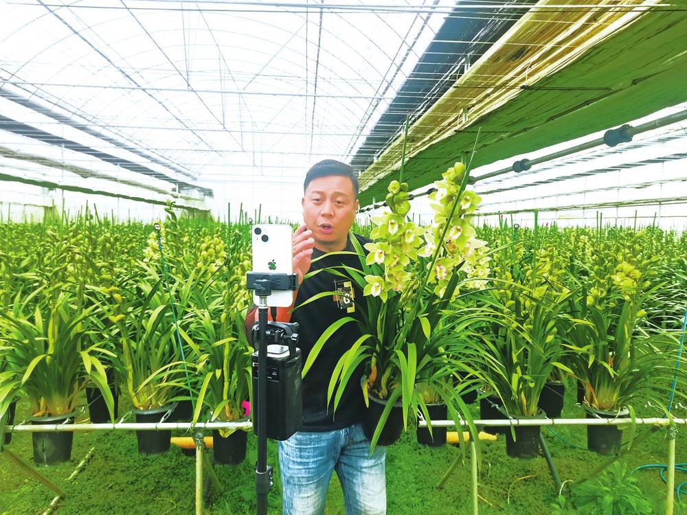 在群英兰花专业合作社的基地里,主播普小伟正通过直播细致介绍花卉特色与养护知识,实时回应订单咨询。他的团队自2023年起步,已从3人扩展至10人,如今日接单量近600单。
