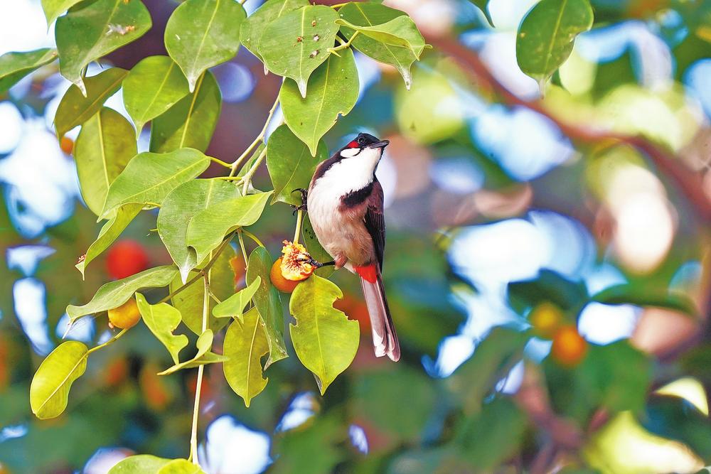 盈江,红耳鹎在榕树枝头觅食。记者马楠 通讯员 颜秋 摄