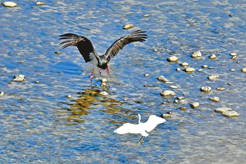 梁河,黑鹳与白鹭翩跹戏水。梁河县融媒体中心供图