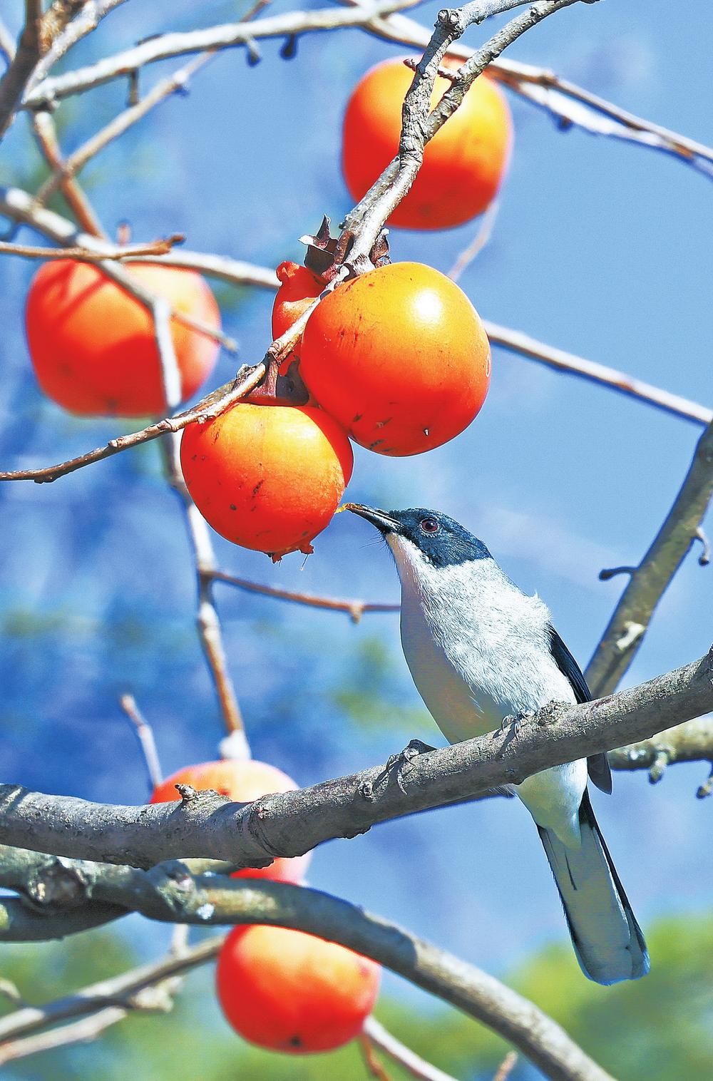 曲靖,鸟儿在枝头啄食柿子。新华社发 孙文来 摄