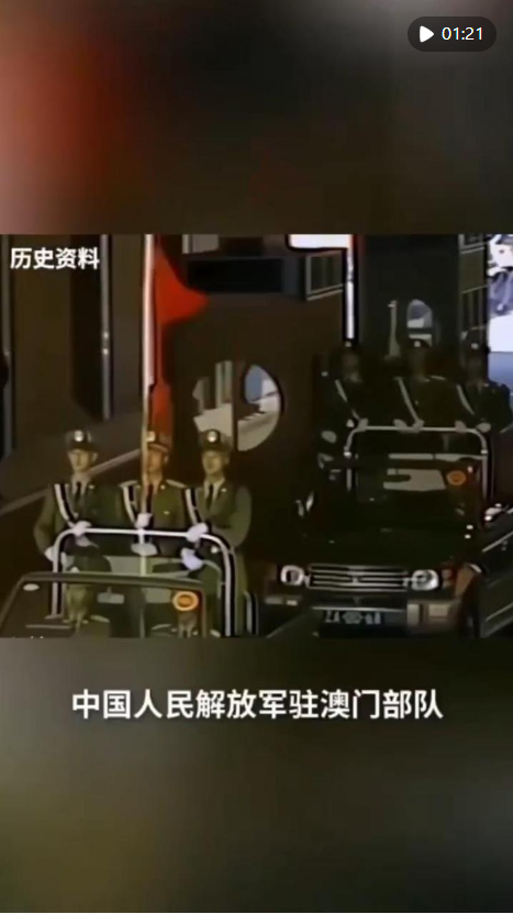 1999年12月20日,作为国家恢复行使主权的象征,中国人民解放军驻澳门部队,高擎军旗昂首跨过拱北口岸,正式进驻澳门履行防务职责。