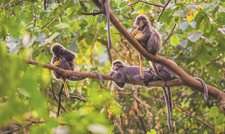 在林间小憩的中缅灰叶猴。 (德宏融媒记者 朱边勇 摄)