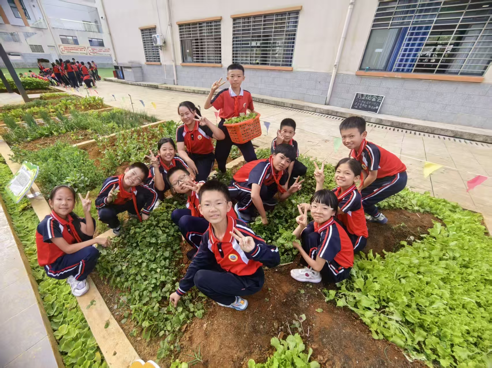 五年级的学生在采摘自己种的生菜和苋菜。
