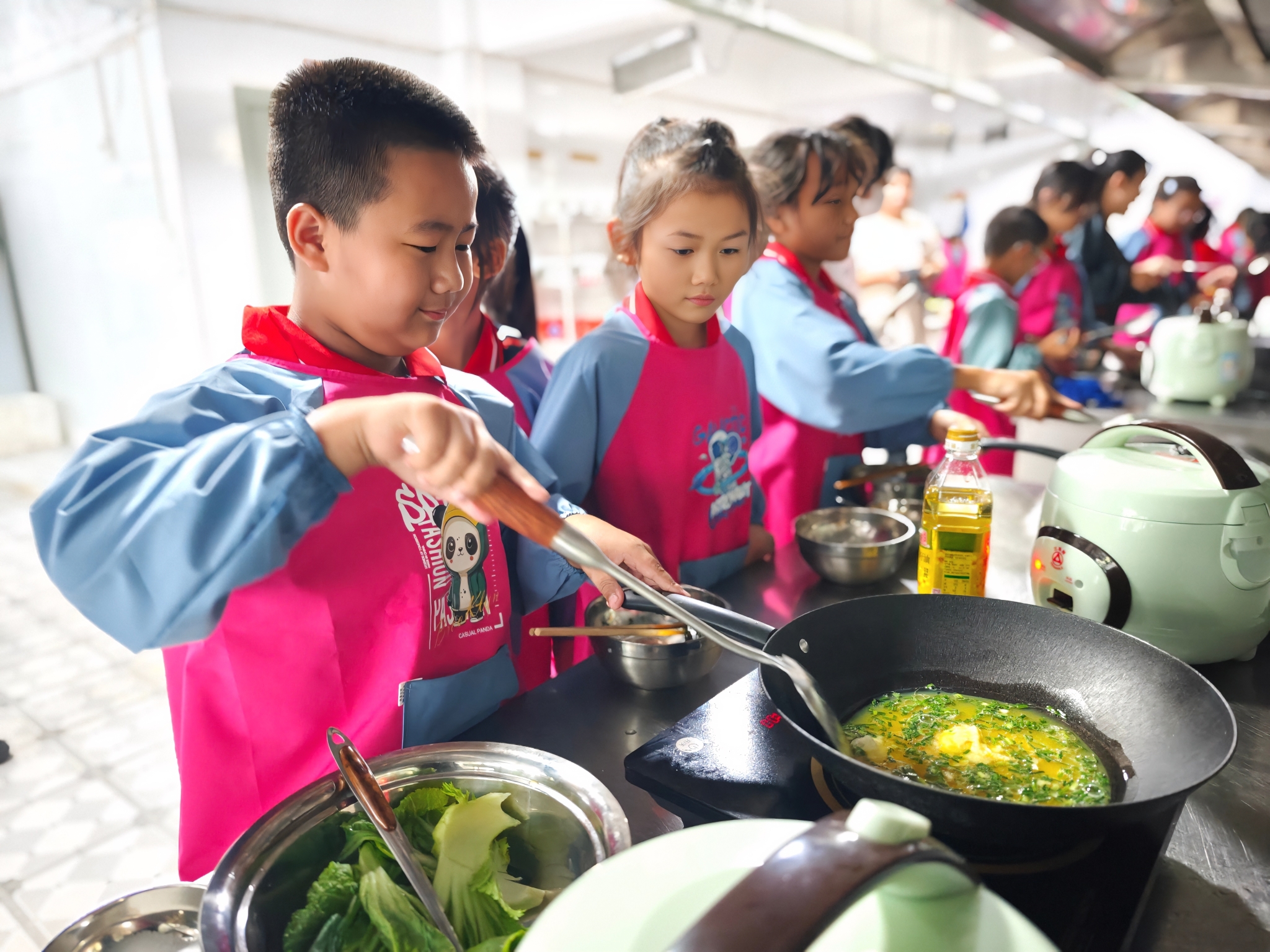 四年级的学生在做蛋炒饭。