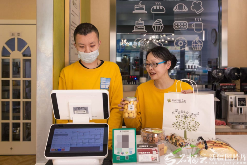 12月17日,乌鲁木齐新禾特青烘焙坊,“心青年”(左)与李秀琴协作收银。 辛轩 摄