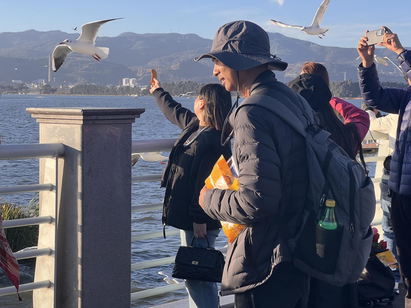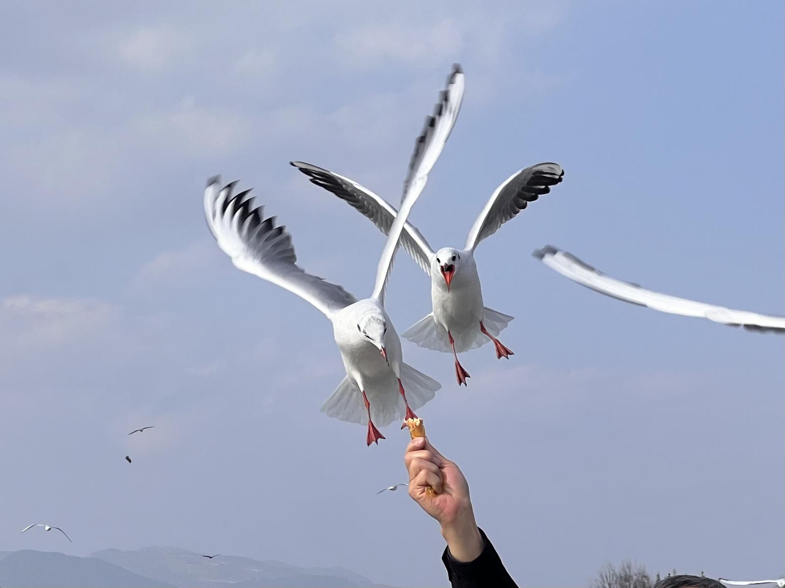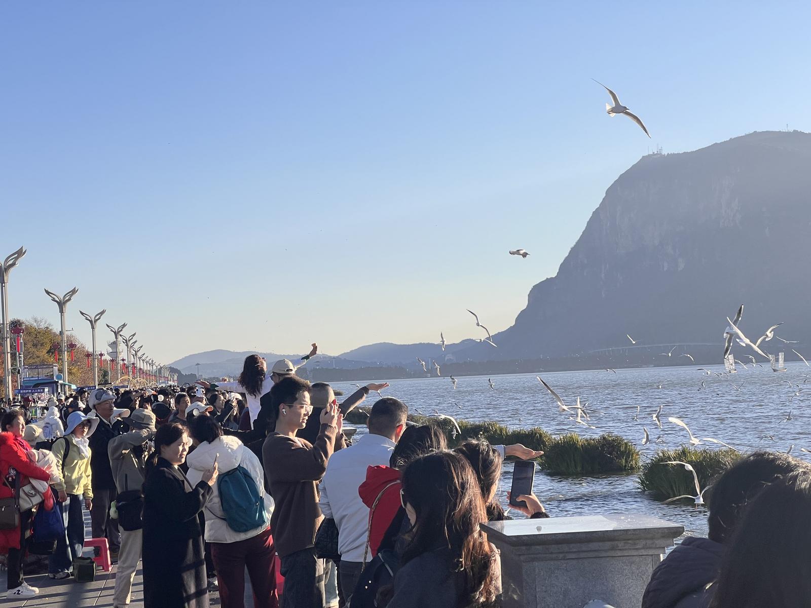 观鸥季,昆明迎来了大批前来观鸥的游客。投喂红嘴鸥是不少游客观鸥时必做的事情之一。