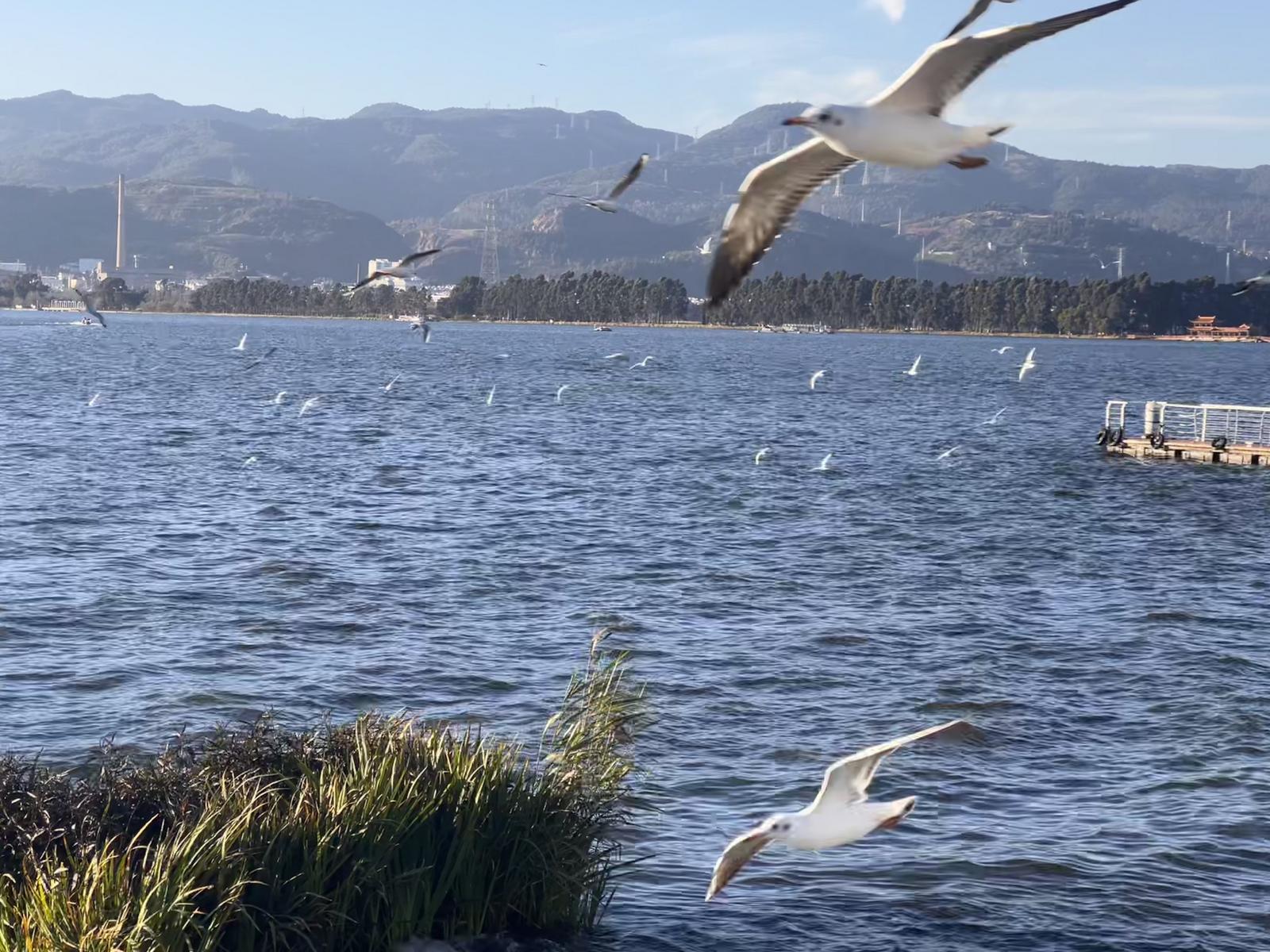12月22日下午,记者来到海埂大坝。暖阳穿透云层,洒在滇池的水面上,成群的红嘴鸥翩跹起舞,此起彼伏的鸥鸣与游人的欢笑声交织在一起。坝上随处可见投喂红嘴鸥的游客,大人小孩一齐动手,将食物撕成小块抛向空中。红嘴鸥时而低空盘旋、精准叼食,时而落在岸边悠闲啄食,呈现出一幅人与自然和谐共处的生动画面。