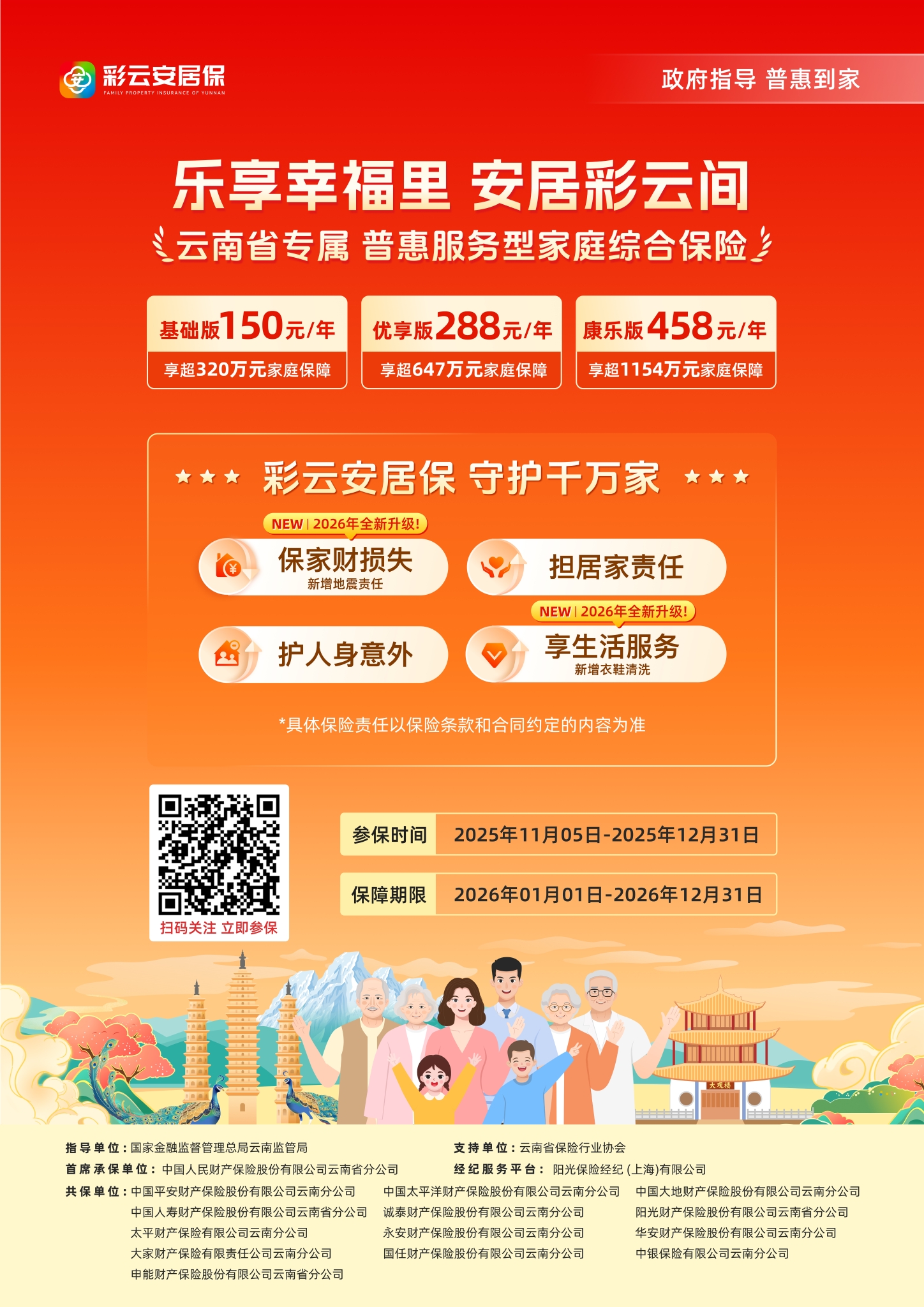2025年11月5日,“乐享幸福里 安居彩云间”2026年度“彩云安居保”产品上线发布会在昆明举行。“彩云安居保”是为积极响应党和国家号召,贯彻落实《关于加强新市民金融服务工作的通知》精神而推出的普惠服务型家庭综合保险。人保财险牵头共14家保险公司共同承保。截至2025年,该产品累计为全省18万余户家庭提供风险保障5657亿元,赔付金额达765万余元。据悉,2026年度“彩云安居保”的投保截止时间为本月底,有投保需求的家庭可抓紧时间办理。
