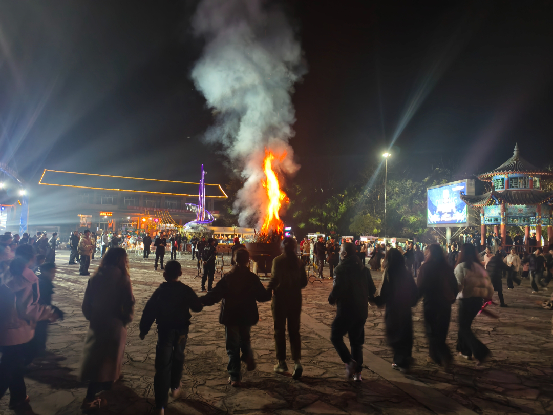 中场休息时,相石阶森林公园的观赛点更是点燃了篝火,球迷们围着跃动的火焰,自发围成圈,随着民族音乐跳起欢快的舞蹈,现场秒变“露天派对”。“现场氛围太燃了!没想到看球还能围着篝火跳舞,像过节一样!”带着家人前来观赛的罗平本地居民杨几贤兴奋地说。