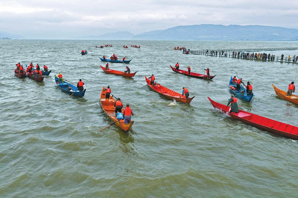 12月25日12时,随着发令枪响,40艘渔船从星云湖望海码头起航,“滇国故里·鱼跃星云”江川第18届开渔系列活动正式启动。本届开渔系列活动将持续至2026年1月10日,包含文艺演出、跨年晚会、烟花表演、无人机表演、商贸展销等。云南李家山青铜器博物馆专题展览和古玩集市同步举行。云南日报 记者王剑钊/摄