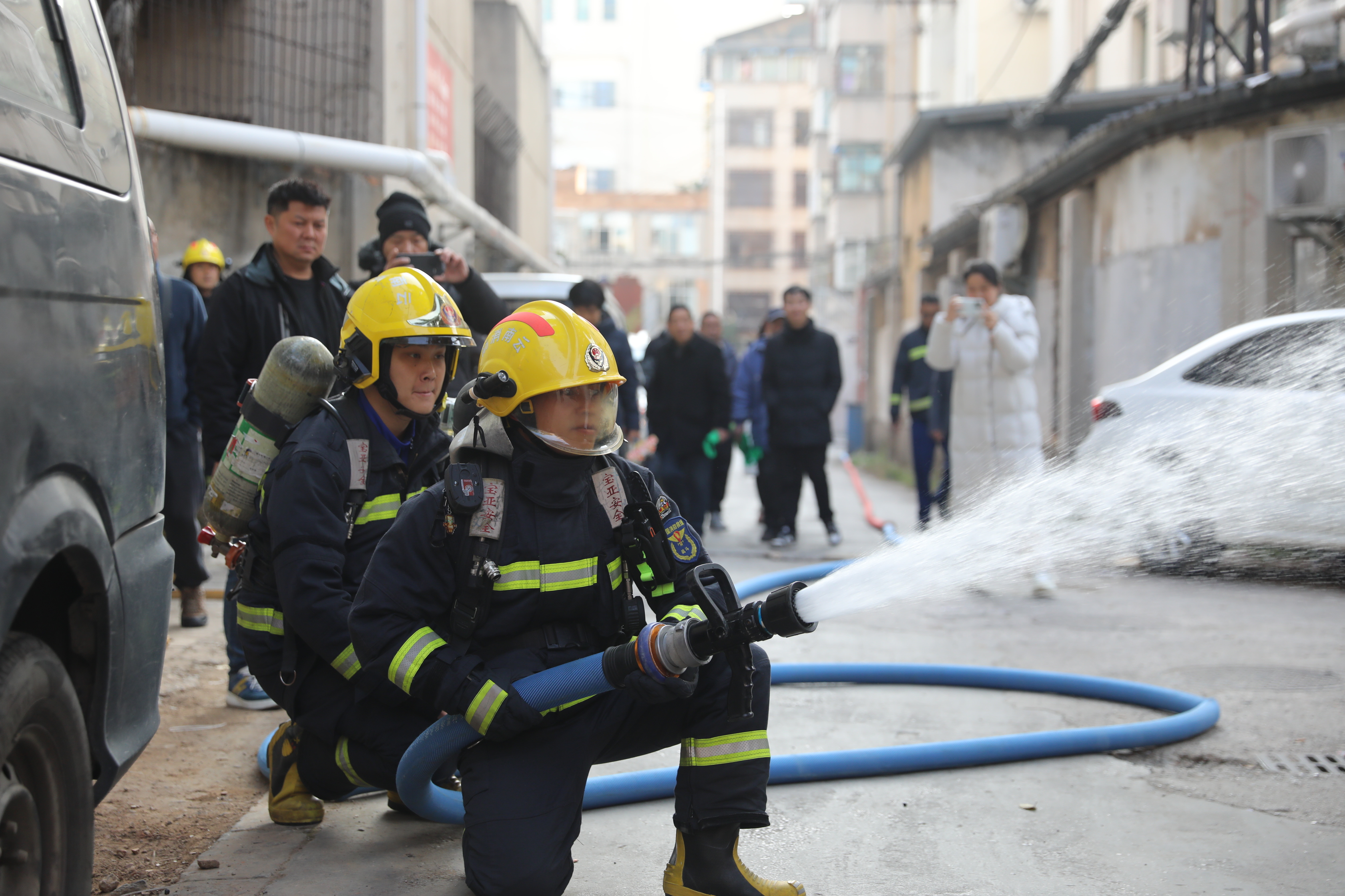 模拟演练环节更是高潮迭起,成为整场活动的焦点。现场模拟社区路边停放的机动车发生自燃,报警信号发出后,在社区工作人员的积极引导下,消防救援车迅速奔赴现场,但刚驶入灵光社区狭窄路段,便因通道两侧堆放的杂物及临时停放的车辆无法继续前行,原本可直达起火点的救援路线被迫中断。此时,消防员立即下车,迅速从消防车上卸下水带,三人一组默契配合,迅速展开水带线路铺设,在狭窄的通道中仅用一分钟便完成了水带连接与延伸,将水枪精准对准模拟起火点。随着指挥员一声令下,水流瞬间喷涌而出,精准直击火源,成功控制“火情”。