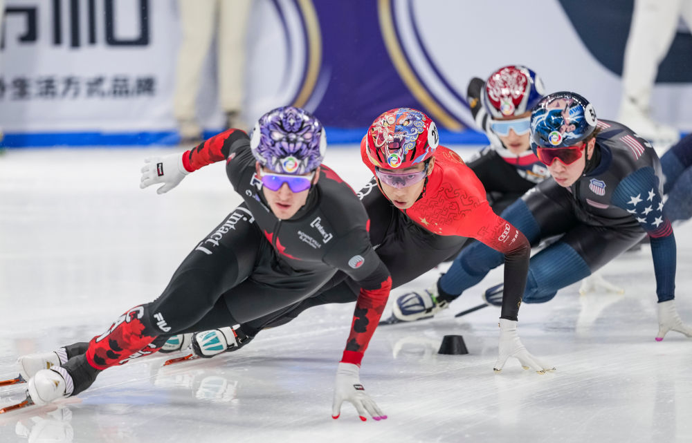 ↑2025年3月16日,中国队选手孙龙(左二)在2025年国际滑联世界短道速滑锦标赛男子5000米接力A组决赛中。