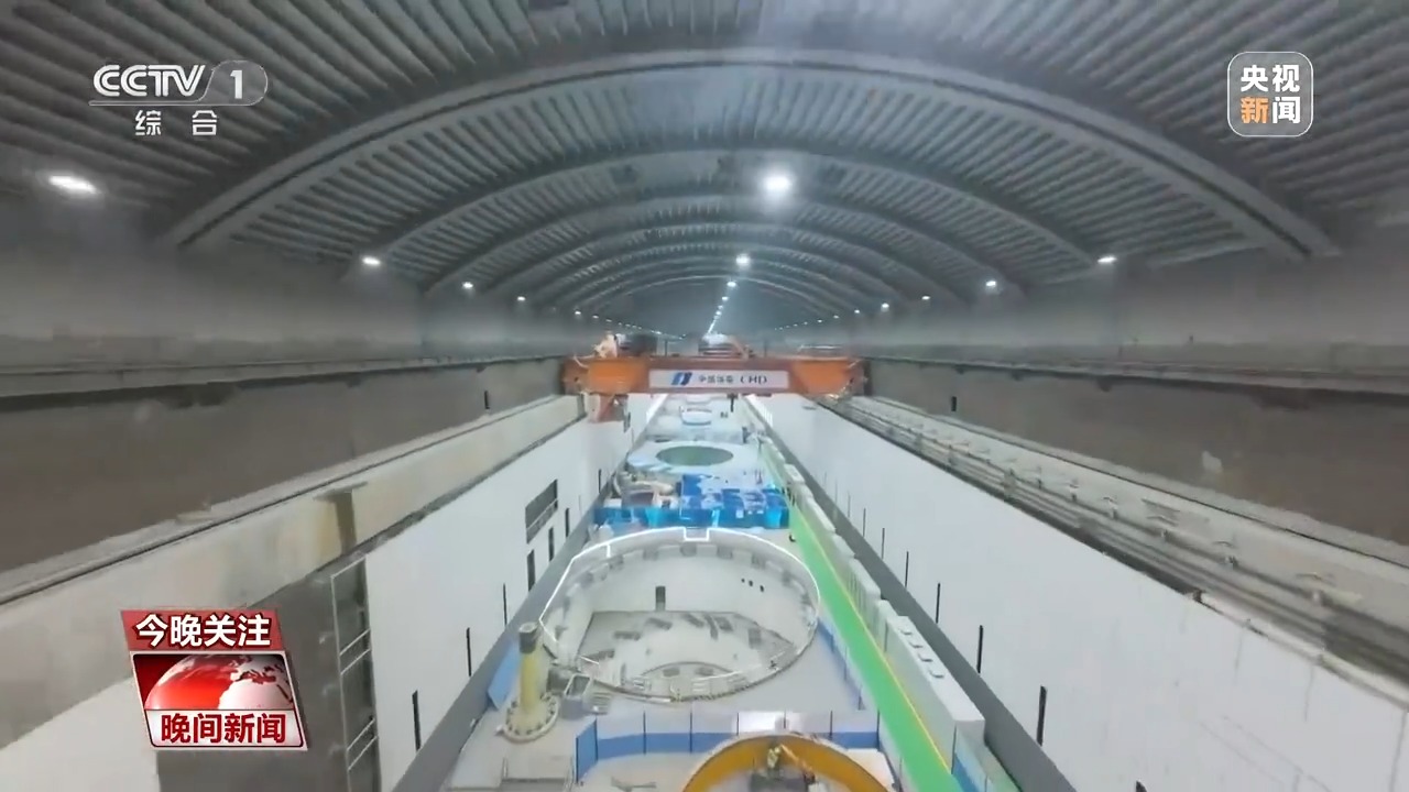 水电站究竟是如何发电的?记者身后就是发电机组最关键部件之一的转轮,澎湃的高压水流从190米的高处冲击下来,推动转轮高速旋转。它1分钟通过的水量近2万立方米,能够灌满大概8个标准游泳池,可满足超过4万个三口之家一年的用电需求。