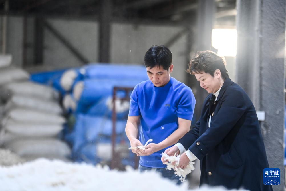 在广西贵港市港南区桥圩镇一家羽绒制品生产企业,工作人员(右)向顾客展示自己企业生产的羽绒(12月18日摄)。