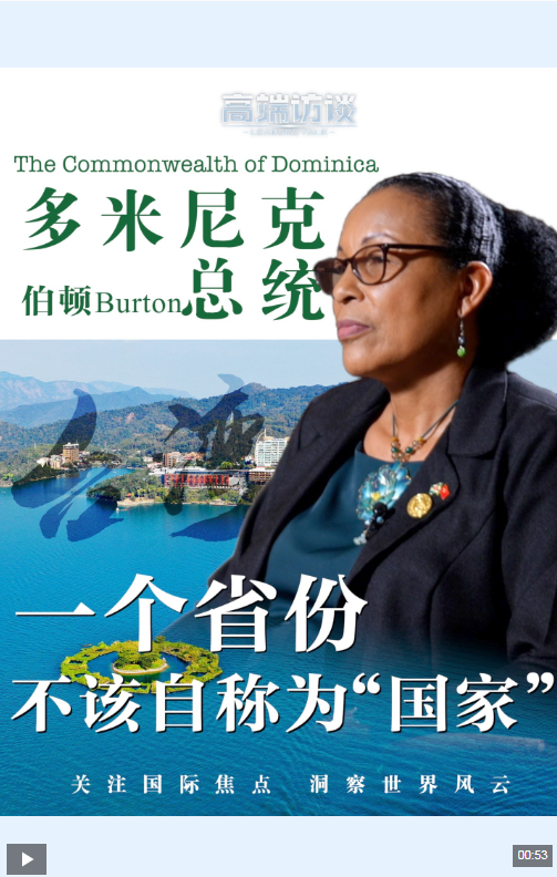 近日,多米尼克总统伯顿接受总台《高端访谈》栏目专访时表示:我们坚信世界上只有一个中国。中国应该实现统一,因为本来就是一个国家。一个省份不应自以为是一个“国家”,并对抗自己的祖国。因此,我们始终坚定支持中国的立场,支持中国实现完全统一。