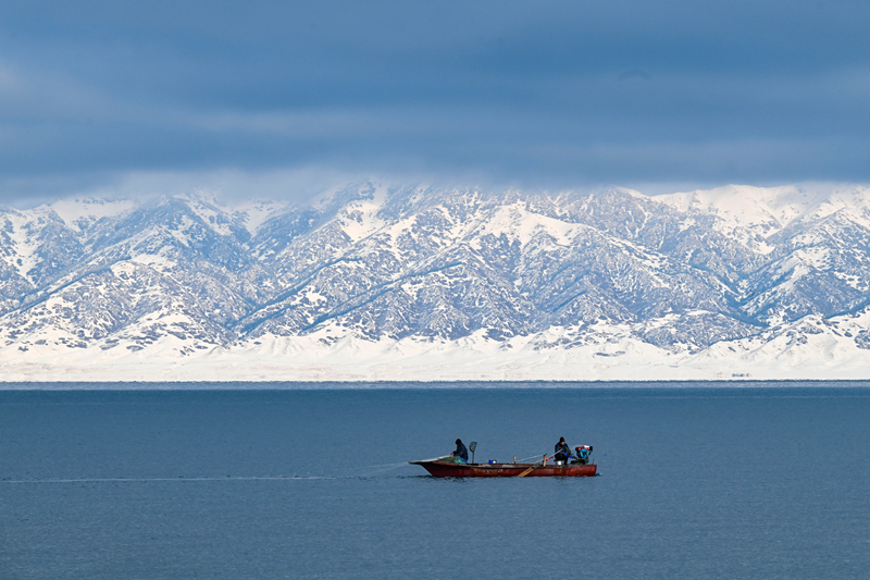 一条小船在赛里木湖中驶过(12月16日摄)。赛里木湖位于博尔塔拉蒙古自治州,是新疆海拔最高、面积最大的高山湖泊。新华社记者王菲摄