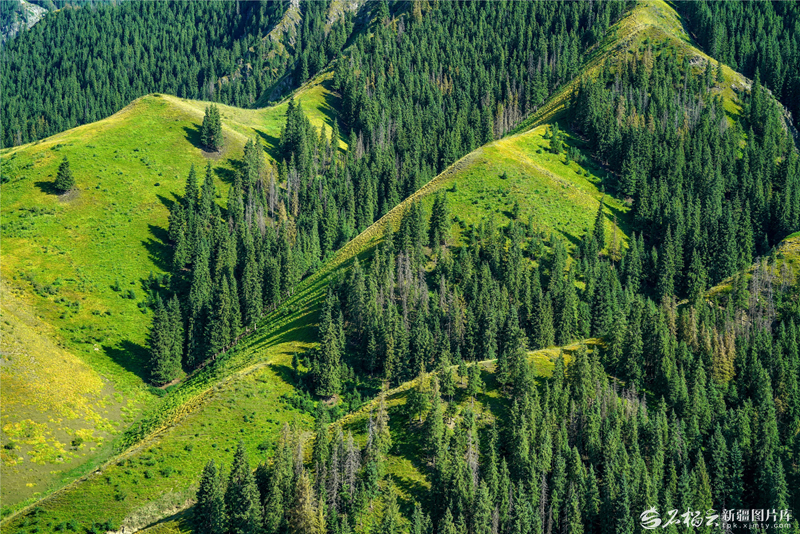 夏日的昌吉市庙尔沟乡索尔巴斯陶景区,苍松翠柏、峰峦叠嶂(7月26日摄)。杨斌摄