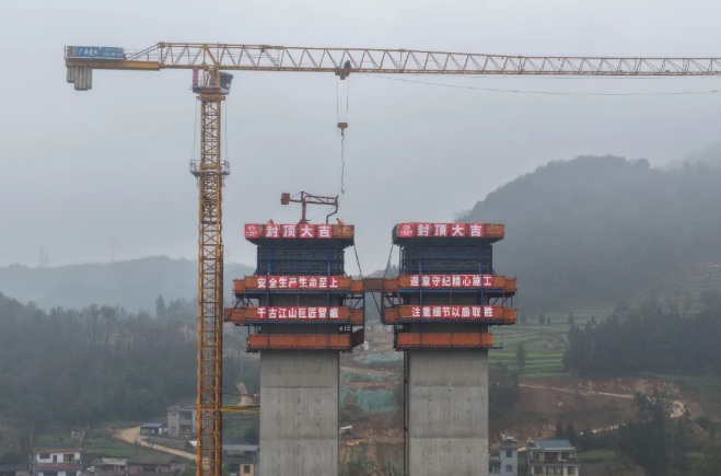 在施工过程中,面对高墩施工中的混凝土输送、模板安拆、线形控制、高空作业安全等一系列挑战,项目部采用了双肢墩连体液压爬模施工工艺、智能监控系统等技术,实现了施工过程的智能化、精细化管控。同时,严格落实安全生产责任制,加强现场安全教育和风险排查治理,确保了高墩施工全程安全可控、质量优良。