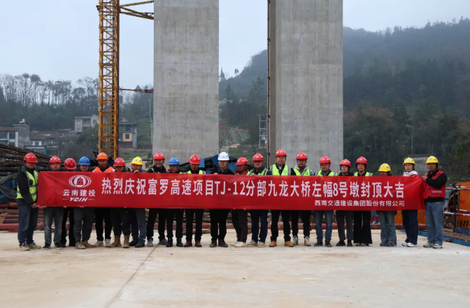 本次封顶的最高墩柱为矩形空心薄壁墩,位于罗平县九龙街道牛街社区附近,设计墩高75米。九龙大桥是富罗高速“一枢纽三桥六隧”关键工程之一,其左幅全长815米,右幅全长772米,主桥采用(70+130+130+70)米变截面悬浇预应力混凝土连续箱梁设计,上跨牛街河与S205省道,全桥共设14个薄壁空心墩,8号墩柱为全线最高墩。