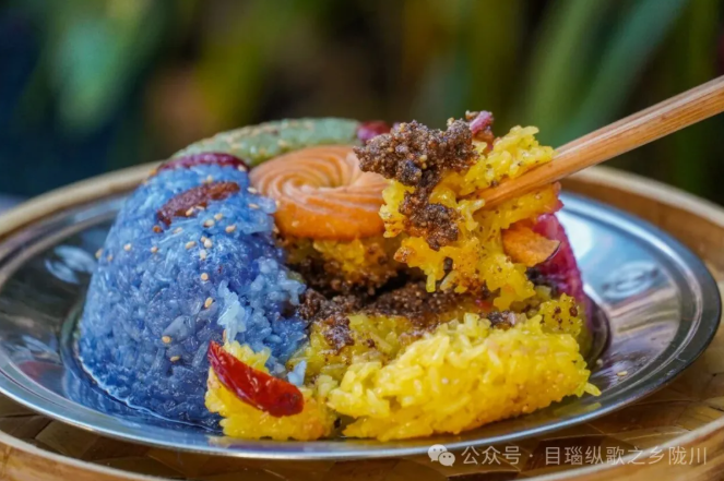 最后盖一层彩色糯米饭压实
