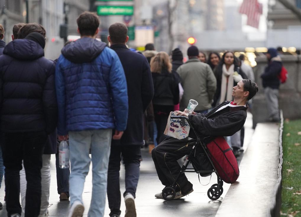 12月18日,一名男子在美国纽约曼哈顿街头寻求救助。新华社记者张凤国摄