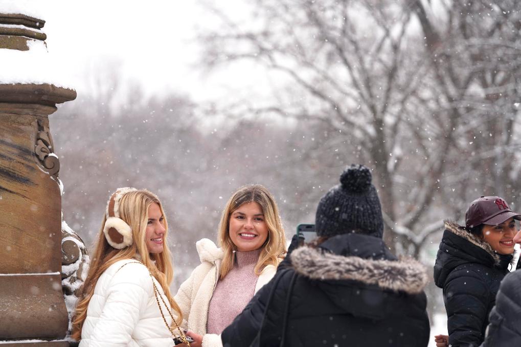 12月27日,在美国纽约中央公园,人们在雪中留影。新华社记者张凤国摄