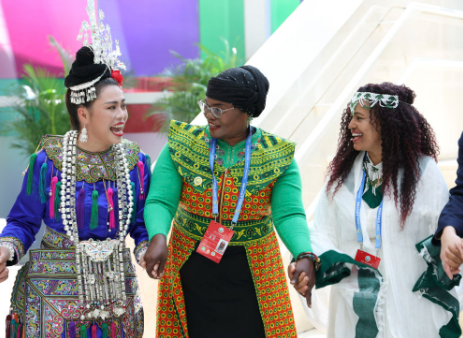 2025年10月14日,在全球妇女峰会配套活动“数智赋能妇女和女童成果展”,来自坦桑尼亚和埃塞俄比亚的嘉宾与侗族大歌表演者们一起载歌载舞。新华社记者 梁旭 摄
