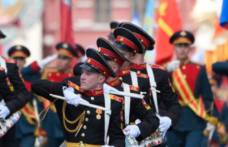 2025年5月9日,在俄罗斯首都莫斯科,军乐队参加纪念苏联伟大卫国战争胜利80周年阅兵式。新华社记者 赖向东 摄