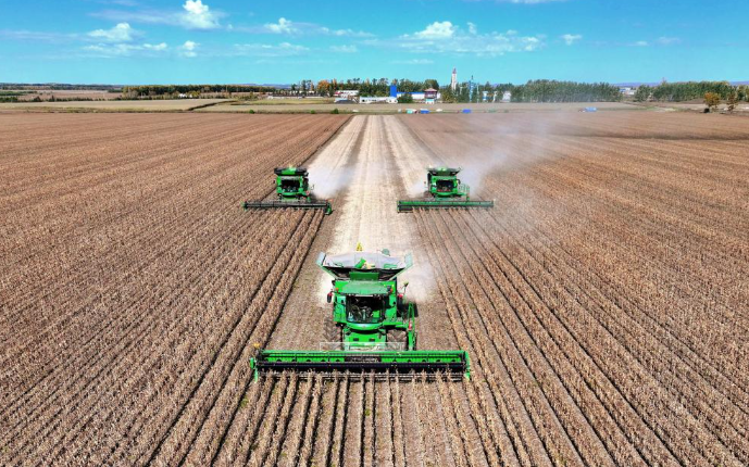 9月29日,在北大荒集团黑龙江尾山农场有限公司第一管理区,农机进行大豆收获作业(无人机照片)。