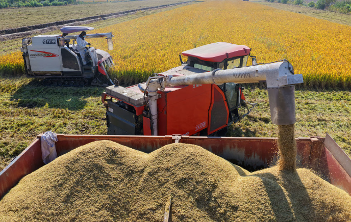11月5日,江苏省农垦农业发展股份有限公司南通分公司收割机卸运刚刚收割的水稻(无人机照片)。