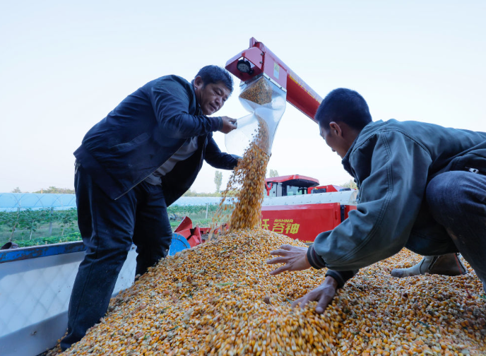 10月13日,山西省运城市万荣县里望乡村民趁着晴好天气抢收玉米。新华社发(闫鑫摄)