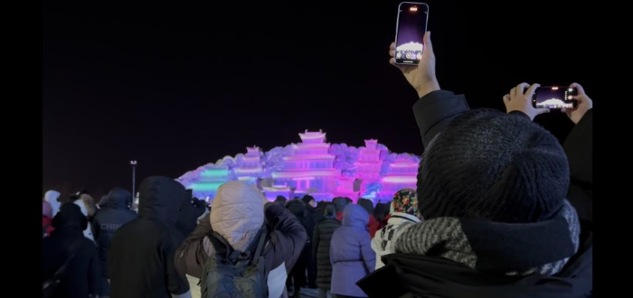 夜幕降临,长白山麓的夜色被灯火与欢呼声点亮。来自辽宁的“95后”游客李然举着相机连拍,镜头里既有雪雕光影的璀璨,也有她与“青铜门”的创意合影。