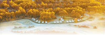 新疆于田县达里雅布依老村地处沙漠腹地,不通公路、没有通信信号和稳定供电。整村易地扶贫搬迁后,当地在老村附近发展沙漠探险等特种旅游,吸纳村民加入旅游合作社,拓宽增收渠道。图为老村附近的胡杨林带和新修的民宿。 |