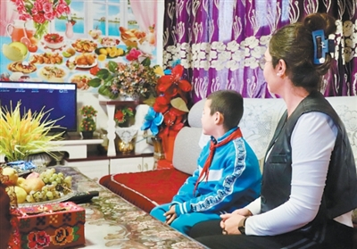艾孜热提罕·木沙和儿子在新家一起看电视。 |