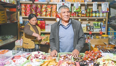 村民艾尼瓦尔·买提斯地克(右)和妻子一起在达里雅布依老村经营一家小商店,为到访的游客提供便利。 |