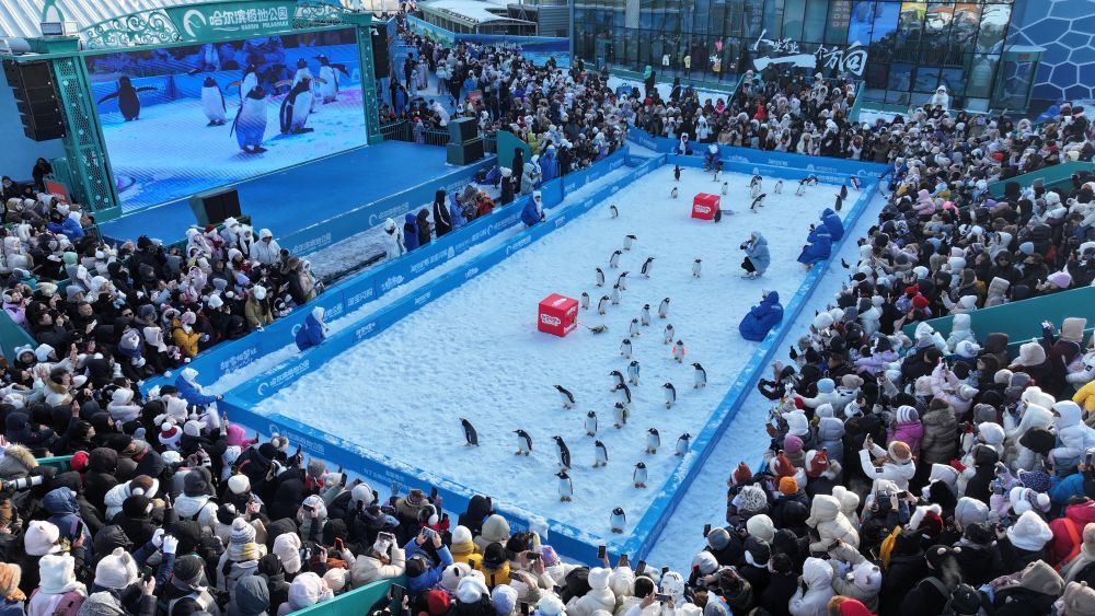新年的第一天,哈尔滨极地公园的100只企鹅开启“萌宠约会”,其中“淘学企鹅”背着小书包,和小伙伴们在雪地里嬉戏,吸引许多游客驻足观看。