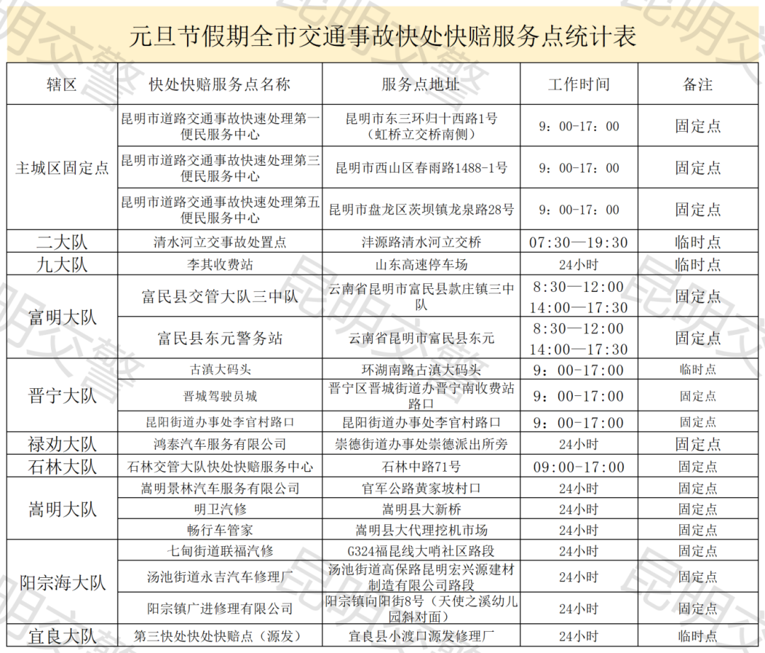 元旦假期昆明市快处快赔服务点公布