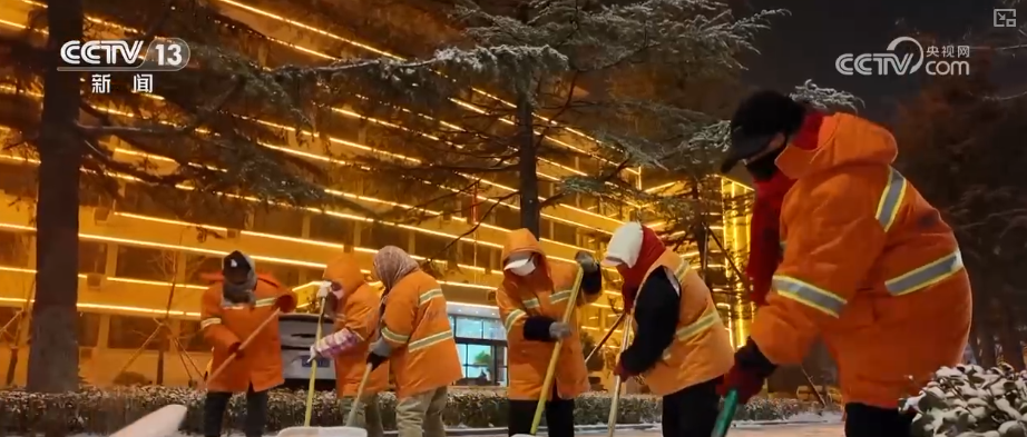 降雪后,当地环卫部门组织人员连夜上岗,清扫路面积雪。