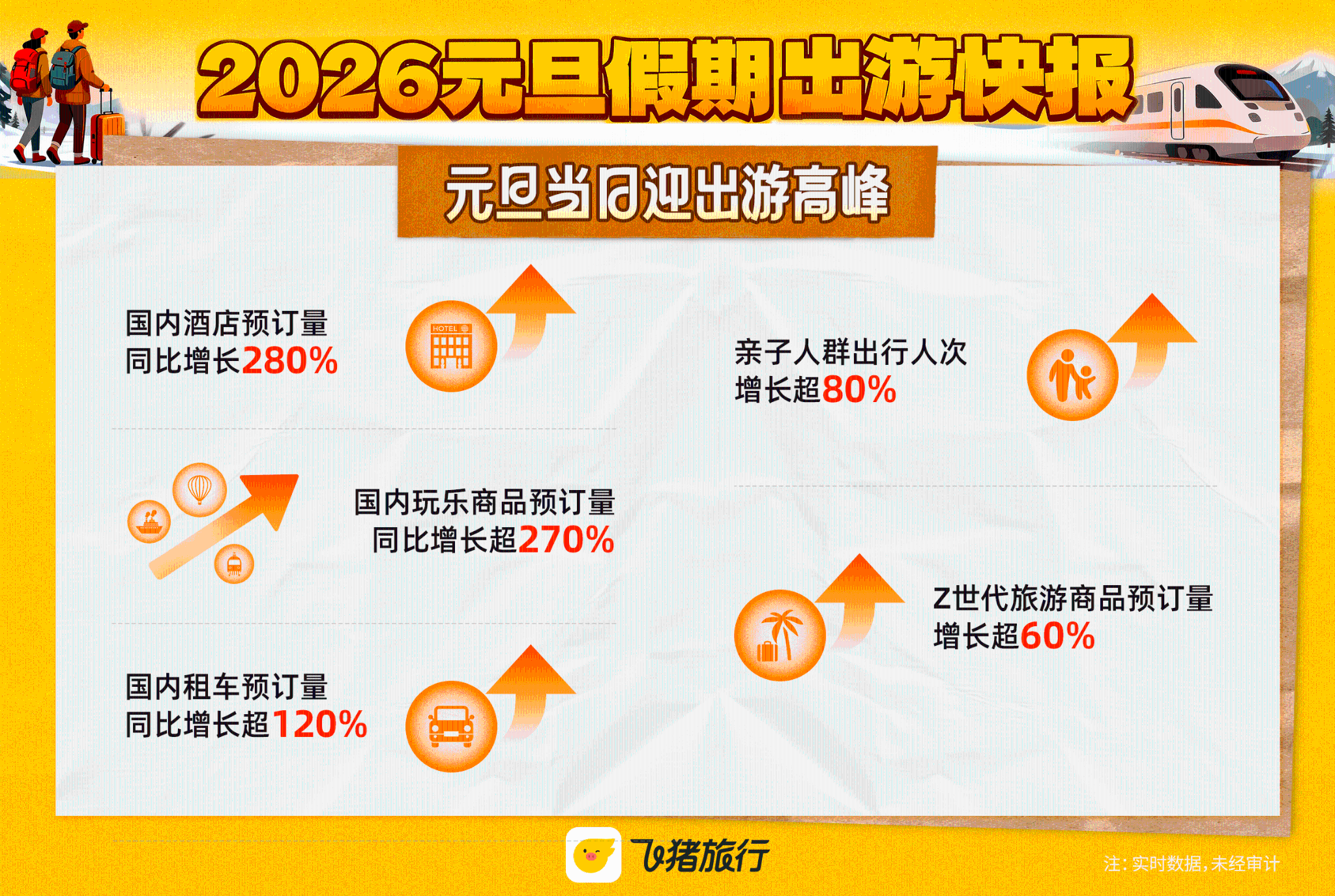 受“请3休8”拼假攻略的强力驱动,2026年元旦旅游市场火热开局。1月3日,飞猪发布的《2026元旦假期出游快报》显示,消费者出游意愿与消费力双双提升:人均购买件数同比增长超20%、人均消费金额同比去年增长超30%。1月1日元旦当天,飞猪国内酒店预订量同比去年劲增280%,国内目的地玩乐商品预订量同比增长超270%。