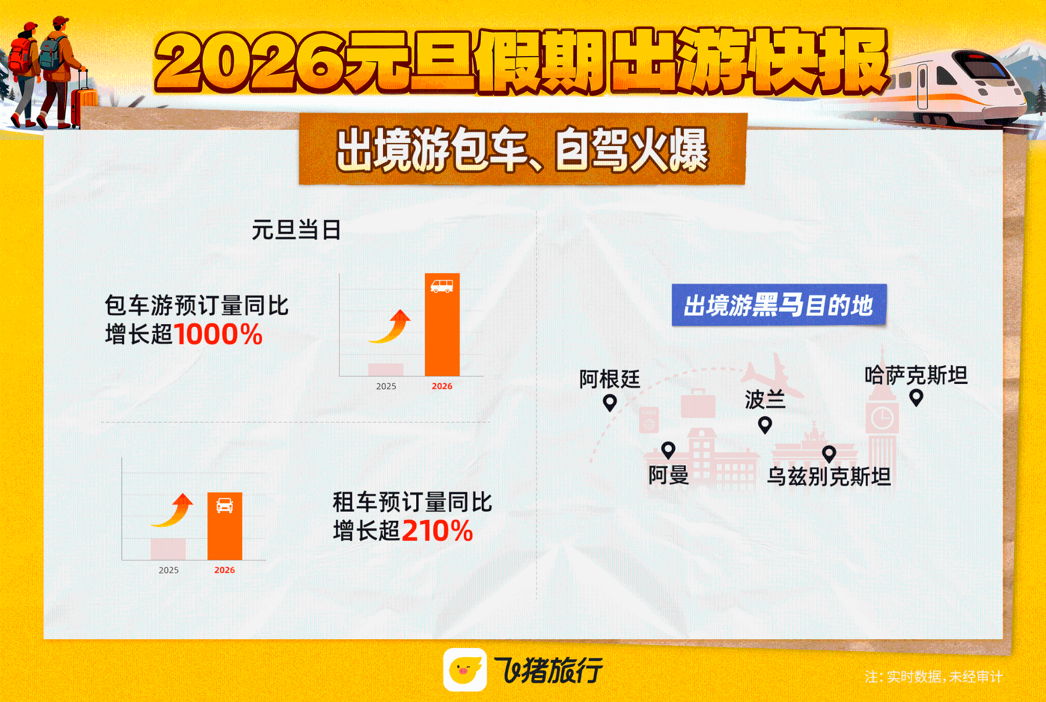 出境游方面,兼具自由度与舒适性的玩法热度高涨。飞猪数据显示,元旦当日,包车游预订量同比去年增长超10倍,租车预订量同比增长超210%。
