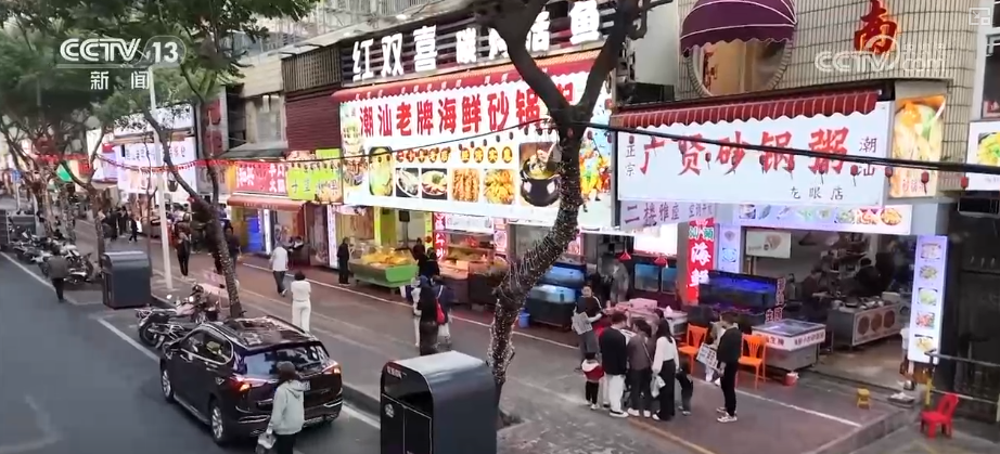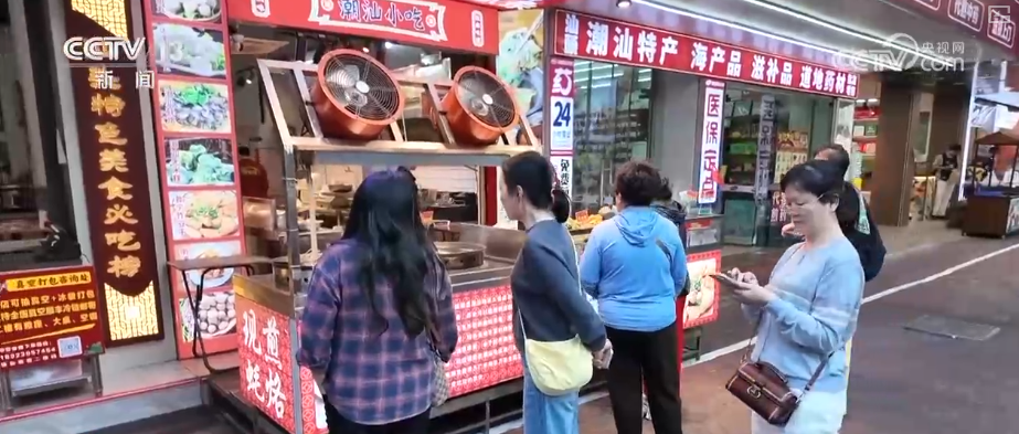 第一站来到汕头著名的美食集聚地龙眼南路美食街,这里全长470米,涵盖潮汕特色美食、茶饮甜品、创意餐饮等。游客不仅可以吃上肠粉、粿条汤等传统早餐,还能品尝卤鹅、生腌等招牌菜肴,以及反沙芋头、腐乳鸡翅等特色小吃。这条24小时不打烊的美食街吸引了来自全国各地的游客。