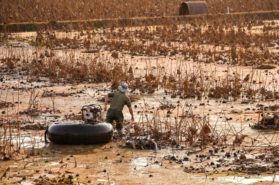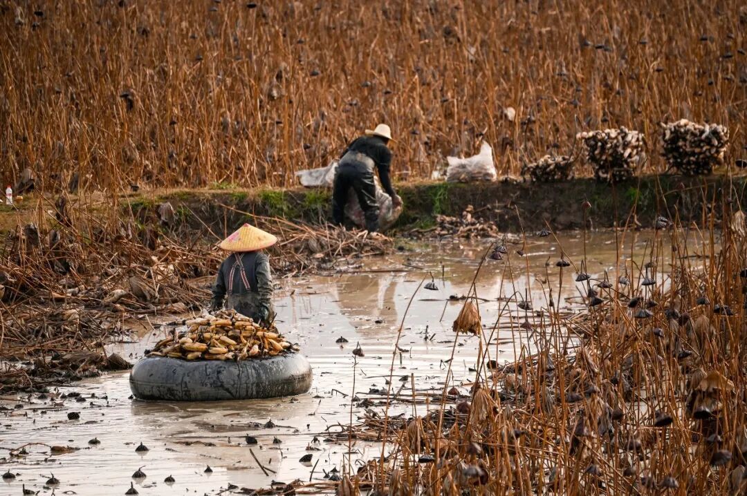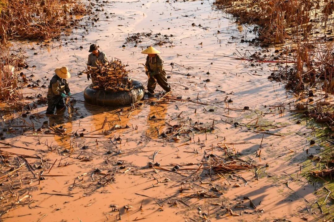 在千亩荷塘,藕农站在藕田里用高压水枪冲刷着淤泥,在荷塘的水面上,漂浮着几个大轮胎,它是采藕的运输工具,藕农将采好的藕小心地放置在轮胎上,然后借助水的浮力,用绳子拖着轮胎将藕运送到田埂上。